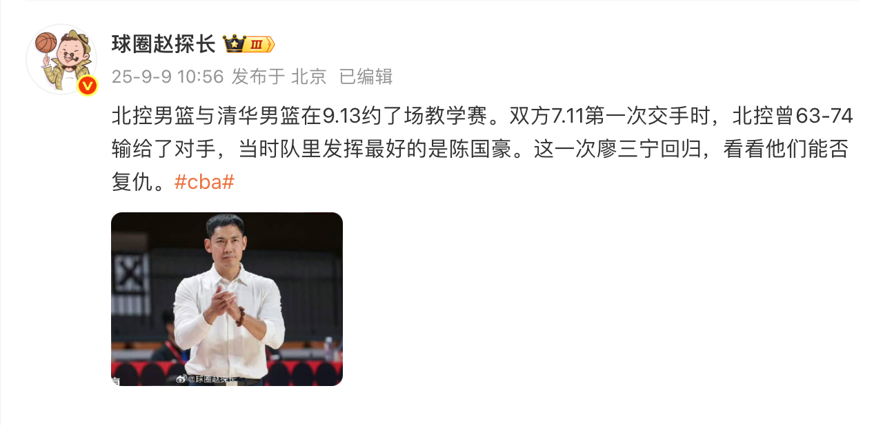 原文表示:北控男篮与清华男篮在9.13约了场教学赛。双方7.11第一次交手时,北控曾63-74输给了对手,当时队里发挥最好的是陈国豪。这一次廖三宁回归,看看他们能否复仇。